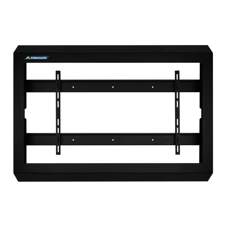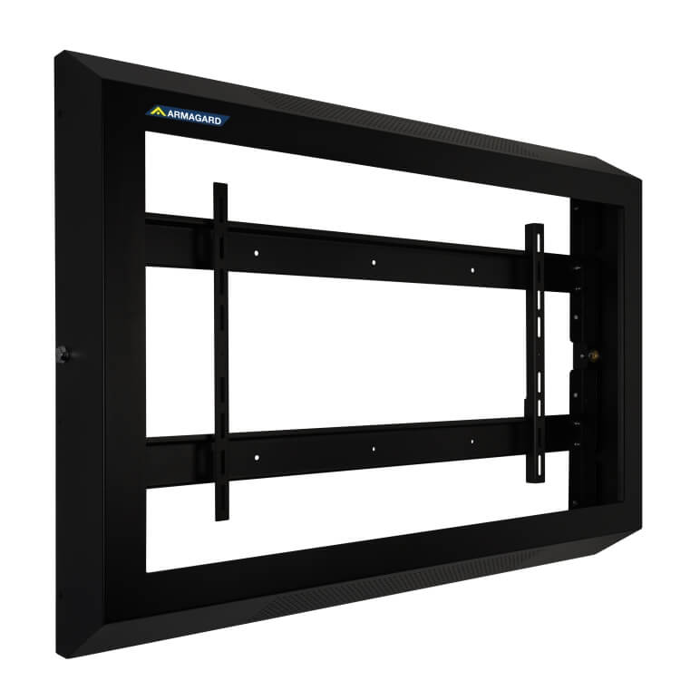 La copertura rigida per TV antivandalo supporta l’installazione di qualsiasi display commerciale con montaggio VESA. Il sistema è composto da due componenti principali: il display viene inizialmente fissato a una staffa interna montata a parete, dopodiché il guscio protettivo per TV viene posizionato sopra lo schermo e bloccato in sede, mediante viti a filo e due serrature azionate a chiave.