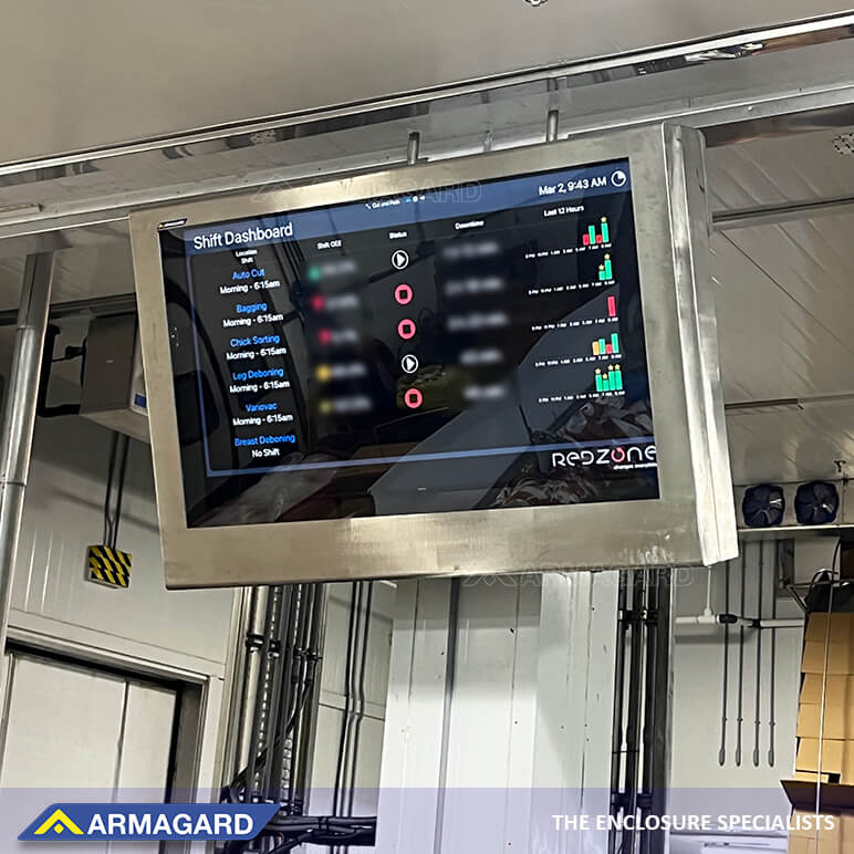 Installa in modo sicuro il software di produzione in area produttiva utilizzando un monitor industriale telaio inox per QAD Redzone da 55", igienico e con grado di protezione IP56/65 contro acqua e polveri. Realizzato in acciaio inox 316 per uso alimentare, offre un’elevata resistenza alla corrosione e proprietà antibatteriche. Il telaio in acciaio inox per monitor industriale può essere sottoposto quotidianamente a lavaggi a getto per mantenere livelli di igiene ottimali, fornendo al personale in prima linea informazioni KPI in tempo reale. Disponibile in diverse dimensioni, il contenitore è adatto alla protezione di più display del software di produzione Redzone in area produttiva.